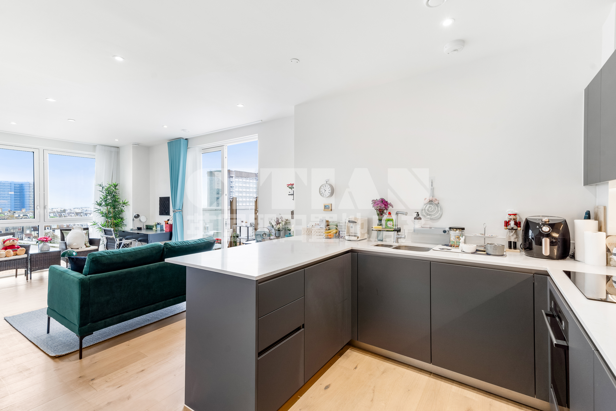 This stylish residence boasts an open-concept design enriched with top-tier finishes and fittings. You'll revel in the luxurious ambiance, highlighted by the meticulously designed Eurocucina kitchen featuring sleek soft-close handleless cabinetry in sophisticated matte graphite grey; ambient under-cabinet lighting; pristine white marble-effect quartzstone countertops, with a striking glass splashback; a chic breakfast bar; and seamlessly integrated Bosch appliances, including an induction hob, oven, dishwasher and fridge freezer. There is a free standing Boch water/dryer in one of the two good sized storage cupboards. The living area also boasts a door leading to your private east facing balcony, overlooking pedestrianised Mighell Street, perfect for enjoying the outdoors in comfort.
